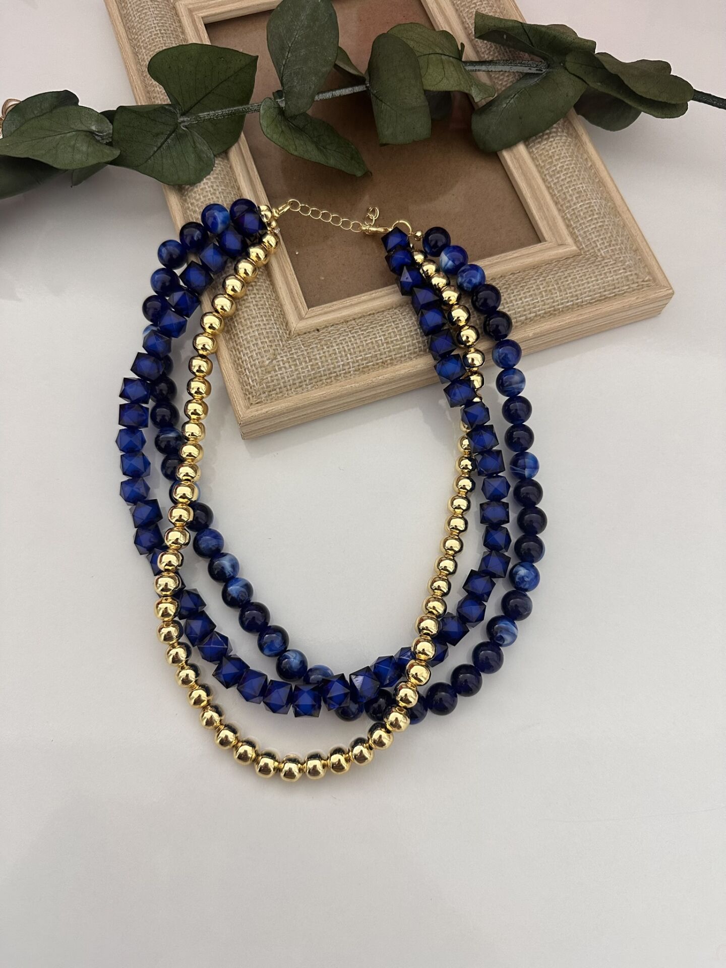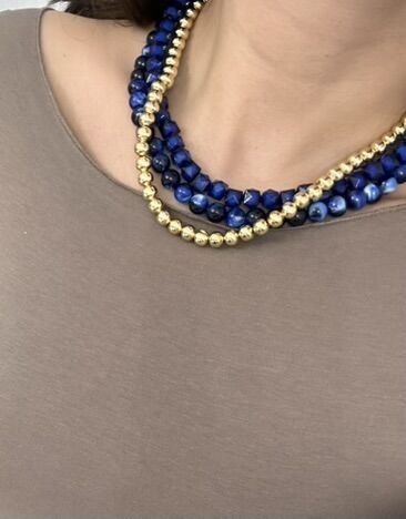 Doğal Taşlı üçlü set kolye mavi ve gold renk .